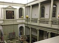 Touro Synagogue was designed by Peter Harrison, a noted British architect and Rhode Island resident. It is considered his most notable work. The interior is flanked by a series of twelve Ionic columns supporting balconies, which signify the twelve tribes of ancient Israel, and each column is carved from a single tree.[5] The building is oriented to face east toward Jerusalem. The ark containing the Torah is on the east wall; above it is a mural representing the Ten Commandments in Hebrew, which was painted by Newport artist Benjamin Howland.