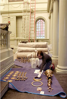 During 2005 and 2006, Touro Synagogue invested in a restoration project for its valued antique metal artifacts. In total, 150 metal objects, from eighteenth century hardware to European chandeliers and silver rimonim (ceremonial bells used on the Torah), needed to be rebuilt, have their surfaces stabilized, and have missing parts replaced. The project was carried out by the Newport-based restoration company Newmans Ltd.[14]
