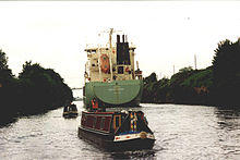 The Manchester Ship Canal is the only purpose built-ship canal in the United Kingdom, and upon opening in 1894 was the largest ship navigation canal in the world allowing for ships with a length of up to 600 feet to navigate its 36-mile route. The deteriorating state of the Irwell Mersey Navigation and the excessive dues charged by the Port of Liverpool fuelled influential Mancunian businessmen such as Daniel Adamson to find a solution, and consequently the idea of a ship canal was formed. The ship canal never became the success its patrons had wished, and traffic peaked in the 1960s. The canal fell into a state of disrepair, but since the 1990s there has been renewed efforts to use the canal more as a transport route. Freight is once again being carried on the canal.[33] The ship canal is also used for leisure,[34] and a scheme to use canal and River Irwell as a waterway to transport commuters has also been envisaged.[35] A trip from MediaCityUK at Salford Quays to Spinningfields in Manchester city centre it is hoped would take 15 to 20 minutes.[36] Manchester Water Taxis ran boats from the Trafford Centre and Old Trafford to the city centre, taking around an hour from the Trafford centre to the city centre and 20 minutes from Old Trafford to the city centre.[37] These came to an end in June 2018, with the company citing a lack of proper landings for customers putting people off [38]