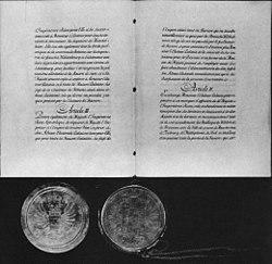 The Treaty of Teschen (German: Frieden von Teschen, i.e., "Peace of Teschen"; French: Traité de Teschen) was signed on 13 May 1779 in Teschen, Austrian Silesia, between the Austrian Habsburg Monarchy and the Kingdom of Prussia, which officially ended the War of the Bavarian Succession.[1]