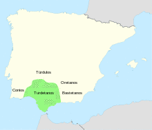 The Turdetani were an ancient pre-Roman peoples of the Iberian Peninsula, living in the valley of the Guadalquivir (the river that the Turdetani called by two names: Kertis and Rérkēs (Ρέρκης); Romans would call the river by the name Baetis),[1] in what was to become the Roman Province of Hispania Baetica (modern south of Spain). Strabo[2] considers them to have been the successors to the people of Tartessos and to have spoken a language closely related to the Tartessian language.
