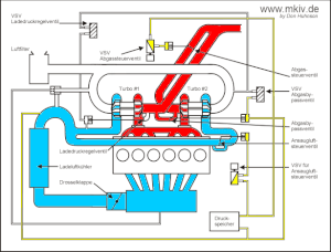 In diesel powered applications, notable examples are Volkswagen's V10 TDI which uses two BorgWarner turbochargers in a parallel layout and BMW's inline 6 B57 engine (B57D30O0, B57D30T0, B57D30S0), which is available in configurations of up to 4 turbochargers that operate in a double-series layout.