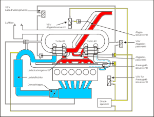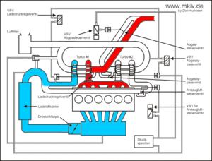 The system is arranged so that a small ("primary") turbocharger is active while the engine is operating at low RPM, which reduces the boost threshold (RPM at which effective boost is provided) and turbo lag. As RPM increases, a small amount of exhaust gas is fed to the larger ("secondary") turbocharger, to bring it up to operating speed. Then at high RPM, all of the exhaust gases are directed to the secondary turbocharger, so that it can provide the boost required by the engine at high RPM.[5]