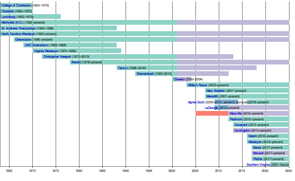 | Methodist University^ | Fayetteville, North Carolina | Monarchs | 1956 | Private/Methodist | 2,215 | 1963 |