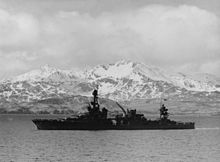 In April, Louisville steamed, via Pearl Harbor, to the Aleutians. There, as a unit of TF 16, the cruiser covered the assault and occupation of Attu (11–30 May) and participated In the pre-invasion bombardment of Kiska in July.[6]