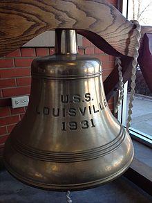 Louisville was launched on 1 September 1930 at the Puget Sound Navy Yard, Bremerton, Washington,[5] sponsored by Miss Jane Brown Kennedy, and commissioned on 15 January 1931, Captain Edward John Marquart in command.[6] Louisville since commissioning day has carried, on the prominent bulkhead, a shoe of the great stallion, Man o' War, as a talisman against evil.[7]