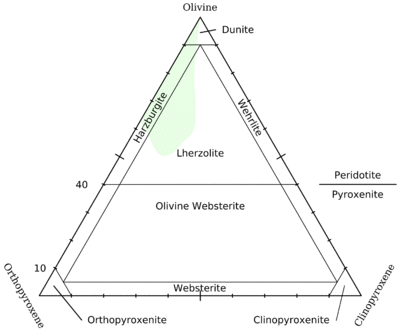 Intrusive ultramafic rocks are often found in large, layered ultramafic intrusions where differentiated rock types often occur in layers.[1] Such cumulate rock types do not represent the chemistry of the magma from which they crystallized. The ultramafic intrusives include the dunites, peridotites and pyroxenites. Other rare varieties include troctolite which has a greater percentage of calcic plagioclase. These grade into the anorthosites. Gabbro and norite often occur in the upper portions of the layered ultramafic sequences. Hornblendite and, rarely phlogopite, are also found.