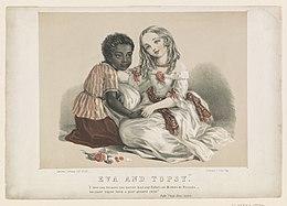 - Topsy – A young slave girl. When asked if she knows who made her, she professes ignorance of both God and a mother, saying "I s'pect I growed. Don't think nobody never made me." She is transformed by Eva's love. During the early-to-mid 20th century, several doll manufacturers created Topsy and Topsy-type dolls. The phrase "growed like Topsy" (later "grew like Topsy") passed into the English language, originally with the specific meaning of unplanned growth, later sometimes just meaning enormous growth.[32]