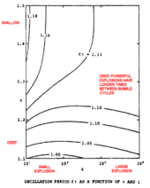 The drastic 60% loss of energy between oscillation cycles is caused in part by the extreme force of a nuclear explosion pushing the bubble wall outward supersonically (faster than the speed of sound in saltwater). This causes Rayleigh–Taylor instability. That is, the smooth water wall touching the blast face becomes turbulent and fractal, with fingers and branches of cold ocean water extending into the bubble. That cold water cools the hot gas inside and causes it to condense. The bubble becomes less of a sphere and looks more like the Crab Nebula—the deviation of which from a smooth surface is also due to Rayleigh–Taylor instability as ejected stellar material pushes through the interstellar medium.