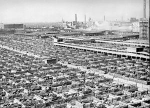 Following the opening of the new Union Stockyards on December 25, 1865, a community of workers began living in the area just west of the packing plants between Ashland Avenue and South Robey Street and bounded on the north by 43rd Street and on the south by 47th Street.[35] At first, the residents were overwhelmingly Irish and German—60% Irish and 30% German.[40] Officially designated the "Town of Lake" until its incorporation into the City of Chicago in about 1870, the neighborhood was known locally as "Packingtown."[14] However, much later in the 1930s, the community would become known as the "Back of the Yards."