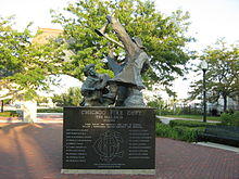 The Chicago Union Stock Yards Fire started on December 22, 1910, destroying $400,000 of property and killing twenty-one firemen, including the Fire Marshal James J. Horan. Fifty engine companies and seven hook and ladder companies fought the fire until it was declared extinguished by Chief Seyferlich on December 23.[38] In 2004, a memorial to all Chicago firefighters who have died in the line of duty was erected just behind the Union Stock Yards Gate at the intersection of Exchange Avenue and Peoria Street.
