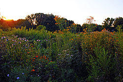 The main research and academic facilities are divided almost evenly between the twin cities of Urbana and Champaign, which form part of the Champaign–Urbana metropolitan area. The College of Agriculture, Consumer, and Environmental Sciences' research fields stretch south from Urbana and Champaign into Savoy and Champaign County. The university maintains formal gardens and a conference center in nearby Monticello at Allerton Park. Four main quads compose the center of the university and are arranged from north to south. The Beckman Quadrangle and the John Bardeen Quadrangle occupy the center of the Engineering Campus. Boneyard Creek flows through the John Bardeen Quadrangle, paralleling Green Street. The Beckman Quadrangle, named after Arnold Orville Beckman, is primarily composed of research units and laboratories, and features a large solar calendar consisting of an obelisk and several copper fountains. The Main Quadrangle and South Quadrangle follow immediately after the John Bardeen Quad. The former makes up a large part of the Liberal Arts and Sciences portion of the campus, while the latter comprises many of the buildings of the College of ACES spread across the campus map.[40]