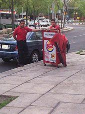 Valet parking attendants directly in front of bars or restaurants may use the limited street parking as "extra-fee" parking. For customers who pay extra to keep their vehicle parked up front, the attendant may park these vehicles in short-term or even prohibited parking spots on the street. These customer vehicles may remain for hours or even an entire evening in a 20-minute, red zone (fire zone), or loading zone.[2] The attendants may evade the city ordinance by shuffling customer vehicles after the meter maid makes their chalking of the car tires, or by placing cones to block access to the spots, or even by using the valet's own vehicle in these spots for later use.[3] Handicapped parking spots are infrequently used due to the very high fines associated.