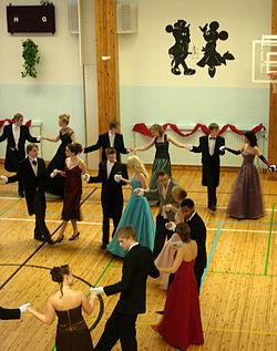 Vanhojen tanssit or wanhojen tanssit in Finnish (English: "ball of the (new) seniors"), de äldstes dag in Swedish (English: "day of the (new) seniors"), is a formal prom held in Finnish upper secondary schools (lukio) during the second year. It is a celebration of when the second-year students (of the three-year lukio) become the seniors of the school. The prom is usually held the day after the third-year students (the seniors) stop attending school and start studying for their matriculation exams in February. The people attending the dances are called vanhat ("seniors"). Sometimes the first word is spelled with a w for a more archaic feel.