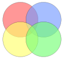 Non-example: This Euler diagram is not a Venn diagram for four sets as it has only 13 regions (excluding the outside); there is no region where only the yellow and blue, or only the red and green circles meet.