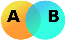 This example involves two sets, A and B, represented here as coloured circles. The orange circle, set A, represents all types of living creatures that are two-legged. The blue circle, set B, represents the living creatures that can fly. Each separate type of creature can be imagined as a point somewhere in the diagram. Living creatures that can fly and have two legs—for example, parrots—are then in both sets, so they correspond to points in the region where the blue and orange circles overlap. This overlapping region would only contain those elements (in this example, creatures) that are members of both set A (two-legged creatures) and set B (flying creatures).