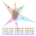 Five-set Venn diagram using congruent ellipses in a five-fold rotationally symmetrical arrangement devised by Branko Grünbaum. Labels have been simplified for greater readability; for example, A denotes A ∩ Bc ∩ Cc ∩ Dc ∩ Ec, while BCE denotes Ac ∩ B ∩ C ∩ Dc ∩ E.