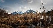 Mount Rundle and Sulphur Mountain as seen from the reeds along the shore of one of the Vermillion Lakes in Banff National Park, Alberta, Canada.