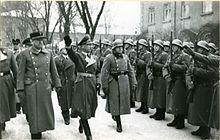 Despite the increasingly dire military outlook in 1943 and 1944, Nasjonal Samling's position at the head of the government, albeit with its ambiguous relationship to the Reichskommissariat, remained unassailable.[128] Nevertheless, the Germans exerted increasing control over law and order in Norway. Following the deportation of the Jews, Germany deported Norwegian officers and finally attempted to deport students from the University of Oslo. Even Hitler was incensed by the scale of the arrests.[130] Quisling became entangled in a similar debacle in early 1944 when he forced compulsory military service on elements of the Hirden, causing a number of members to resign to avoid being drafted.[131]