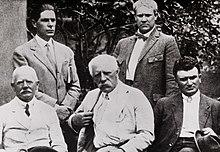 After Nansen died on 13 May 1930, Quisling used his friendship with the editor of the Tidens Tegn newspaper to get his analysis of Nansen onto the front page. The article was entitled "Politiske tanker ved Fridtjof Nansens død" ("Political Thoughts on the Death of Fridtjof Nansen") and was published on 24 May.[43] In the article, he outlined ten points that would complete Nansen's vision as applied to Norway, among them "strong and just government" and a "greater emphasis on race and heredity."[42] This theme was followed up in his new book, Russia and Ourselves (Norwegian: Russland og vi), which was serialised in Tidens Tegn during the autumn of 1930.[44] Advocating war against Bolshevism, the openly racist book catapulted Quisling into the political limelight.[42] Despite his earlier ambivalence, he took up a seat on the Oslo board of the previously Nansen-led Fatherland League. Meanwhile, he and Prytz founded a new political movement, Nordisk folkereisning i Norge, or "Nordic popular rising in Norway," with a central committee of 31 and Quisling as its fører – a one-man executive committee – though Quisling seemed to have had no particular attachment to the term.[45] The first meeting of the league took place on 17 March 1931, stating the purpose of the movement was to "eliminate the imported and depraved communist insurgency."[46]
