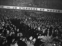 Increased support also materialised when the Bygdefolkets Krisehjelp, the Norwegian Farmers' Aid Association, sought financial aid from Nasjonal Samling, who in turn gained political influence and a useful existing network of well-trained party officers. Quisling's party never managed a grand anti-socialist coalition, however, in part because of competition from the Conservative Party for right-wing votes.[66] Though Quisling remained unable to demonstrate any skill as an orator, his reputation for scandal nonetheless ensured that the electorate were aware of Nasjonal Samling's existence. As a result, the party showed only moderate success in the October elections, with 27,850 votes—approximately two per cent of the national vote, and about three and a half per cent of the vote in constituencies where it fielded candidates.[67] This made it the fifth largest party in Norway, out-polling the Communists but not the Conservative, Labour, Liberal or Agrarian parties, and failing to secure a single seat in Parliament.[67]