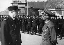 Once the king had declared the German commission unlawful, it became clear that he would never be won over. An impatient Hitler appointed a German, Josef Terboven, as the new Norwegian Reichskommissar, or Governor-General, on 24 April, reporting directly to him. Despite Hitler's assurances, Terboven wanted to make sure that there would be no room in the government for the Nasjonal Samling nor its leader Quisling, with whom he did not get along.[102] Terboven eventually accepted a certain Nasjonal Samling presence in the government during June, but remained unconvinced about Quisling. As a result, on 25 June, Terboven forced Quisling to step down as leader of the Nasjonal Samling and take a temporary leave of absence in Germany.[102] Quisling remained there until 20 August, while Rosenberg and Admiral Erich Raeder, whom he had met on his earlier visit to Berlin, negotiated on his behalf. In the end, Quisling returned "in triumph," having won Hitler over in a meeting on 16 August. The Reichskommissar would now have to accommodate Quisling as leader of the government, then allow him to rebuild the Nasjonal Samling and bring more of his men into the cabinet.[103] Terboven complied and addressed the Norwegian people in a radio broadcast in which he asserted that the Nasjonal Samling would be the only political party allowed.[104]