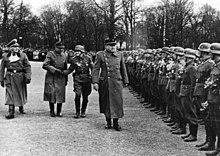 On 5 December 1940, Quisling flew to Berlin to negotiate the future of Norway's independence. By the time he returned on 13 December, he had agreed to raise volunteers to fight with the German Schutzstaffel (SS). In January, SS head Heinrich Himmler travelled to Norway to oversee preparations. Quisling clearly believed that if Norway supported Nazi Germany on the battlefield, there would be no reason for Germany to annex it. To this end, he opposed plans to have a German SS brigade loyal only to Hitler installed in Norway.[108] In the process, he also toughened his attitude to the country harbouring the exiled king, the United Kingdom, which he no longer saw as a Nordic ally. Finally, Quisling aligned Norwegian policy on Jews with that of Germany, giving a speech in Frankfurt on 26 March 1941 in which he argued for compulsory exile, but warned against extermination.[108]