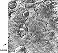The ejecta from Arandas crater acts like mud. It moves around small craters (indicated by arrows), instead of just falling down on them. Craters like this suggest that large amounts of frozen water were melted when the impact crater was produced. Image is located in Mare Acidalium quadrangle and was taken by Viking Orbiter.