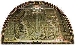 Michel de Montaigne, one of the earliest visitors to leave a description of Pratolino, saw it in 1581,[2] and considered it to have been built, he thought when visiting Villa d'Este, "precisely in rivalry with this place". A long description was published by a Florentine, Francesco de' Vieri, in 1586.[3] Giusto Utens included a view of the southern half of the villa complex among his series of lunettes containing bird's-eye views of the Medicean villas, painted in 1599. Six views were etched by Stefano Della Bella in the mid-17th century, and the picture is rounded out by further 18th century descriptions. Nevertheless, Pratolino has not survived, as other Medici villas have.