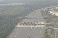 The main toll plaza for the Dulles Greenway is located just west of the exits for Route 28 and Dulles Airport. Additional toll plazas are located on westbound entrance ramps and eastbound exit ramps with the exception of Battlefield Parkway (Exit 2) in Leesburg. The toll varies depending on the toll plaza traversed. As of January 2013, the base toll collected for two-axle vehicles ranges from $3.00 ($2.55 with E-ZPass) at the Shreve Mill Rd plaza to $5.10 at the main plaza to and from the Dulles Toll Road (which includes the $1.00 toll for the Dulles Toll Road).[31] Vehicles with more than two axles are charged higher rates. The maximum toll rises to $5.90 (including the 75¢ Dulles Toll Road toll) during congestion pricing hours, which are 6:30 am to 9:00 am eastbound and 4:00 pm to 6:30 pm westbound.[31] A previous increase in the base fare and the introduction of congestion pricing occurred in January 2009,[32] and tolls rose an additional 30 cents per trip on January 1, 2012.[33] Vehicles traveling through the main toll plaza to or from the Dulles Toll Road are charged two tolls: one for the Dulles Toll Road, and one for the Dulles Greenway. Cash tolls are accepted during limited hours, and credit cards and E-ZPass transponder payments are accepted at all times[34] (see changes for COVID-19 at No Cash Collection). The Greenway is also one of two routes where a subscription membership (exclusive to E-ZPass) allows for an additional discount. Alternate (free) routes include State Route 7 and State Route 28, both of which are generally more congested.[35]