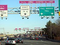 Through December 31, 2013, a main toll plaza west of the Beltway interchange collects a $1.75 toll in both directions for two-axle vehicles. Toll booths located on westbound exit ramps and eastbound entrance ramps collect tolls of $1.00, except at the Route 7 interchange, where tolls are only collected from Route 267 east to Route 7 east. Vehicles with more than two axles are charged higher rates.[16] All tollbooths are equipped with electronic toll collection systems which accept E-ZPass (Virginia to Maine). Fifty cents of each toll is attributable to the financing of the Silver Line to Dulles Airport.[17] On November 14, 2012, the MWAA Board of Directors voted to increase the toll by 25¢ (from $1.50 to $1.75 at the main toll plaza and from 75¢ to $1.00 at the ramp toll booths) effective January 1, 2013; and to increase the toll by an additional 75¢ to $2.50 at the main toll plaza effective January 1, 2014. The 2013 and 2014 toll increases primarily help pay for Phase 1 Silver Line Metrorail construction costs.[18]