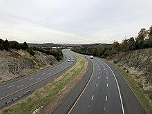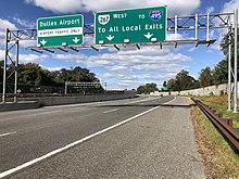 The Dulles Access Road is a four-lane, 13.65-mile (21.97 km)[1][2] highway that runs "inside" the Dulles Toll Road along its median. There are no general-access exits from the westbound lanes, and no general-access entrances to the eastbound lanes, with the exception of gated slip ramps to and from the toll road that buses and emergency vehicles can use. The Access Road was built from the Beltway as part of the construction of Dulles Airport, and opened with the airport in 1962. It was extended to I-66 in 1985.[5]