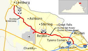 State Route 267 (SR 267) is a primary state highway in the US state of Virginia. It consists of two end-to-end toll roads – the Dulles Toll Road and Dulles Greenway – as well as the Dulles Access Road,[3] which lies in the median of Dulles Toll Road and then extends east to Falls Church. The combined roadway provides a toll road for commuting and a free road for access to Washington Dulles International Airport. The three sections are operated and maintained by separate agencies: Dulles Toll Road and Dulles Access Road are maintained by the Metropolitan Washington Airports Authority (MWAA); the Dulles Greenway is owned by TRIP II, a limited partnership,[4] but is maintained by Atlas Arteria, an Australian company which owns the majority stake in the partnership. The Dulles Access Road's median hosts the Silver Line of the Washington Metro between Reston and Falls Church.