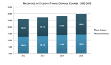 Virtual education is becoming increasingly used worldwide. There are currently more than 4,700 colleges and universities that provide online courses to their students.[3] In 2015, more than 6 million students were taking at least one course online, this number grew by 3.9% from the previous year. 29.7% of all higher education students are taking at least one distance course. The total number of students studying on campus exclusively dropped by 931,317 people between the years 2012 and 2015.[1] Experts say that because the number of students studying at the college level is growing, there will also be an increase in the number of students enrolled in distance learning.[2]