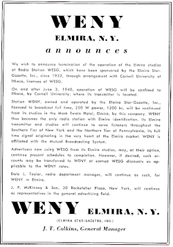 - ^ WENY (advertisement), Broadcasting, May 15, 1940, page 89.