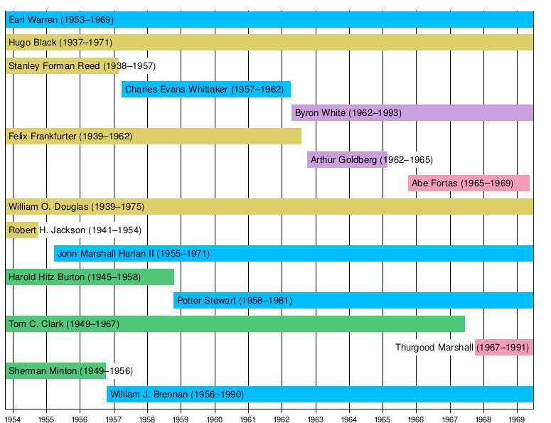 With the exception of the desegregation decisions, few decisions were unanimous. The eminent scholar Justice John Marshall Harlan II took Frankfurter's place as the Court's self-constraint spokesman, often joined by Potter Stewart and Byron R. White. But with the appointment of Thurgood Marshall, the first black justice (as well as the first non-white justice), and Abe Fortas (replacing Goldberg), Warren could count on six votes in most cases.[39]