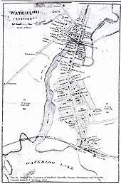 The town was first settled in 1793 by Ezekiel Lewis, an English Loyalist supporter who was originally from Marlborough, New Hampshire. He named his location Lewis Falls and after 9 years, Captain Lewis sold his lot and moved a short distance away. The land was purchased by William Lamoure, a merchant from St-Armand who then sold it to Lazare Letourneau who in turn sold it to Hezekiah Robinson in 1822. Robinson immediately renamed Lewis Falls to Waterloo after the famous battle in which Napoleon Bonaparte was defeated. The name Waterloo was suggested by his father-in-law, Judge Knowlton. Hezekiah Robinson built "The Old Stone Store" in 1829 at the corner of Main Street and Ellis.He donated the land for the first Church of England built in 1843 and his widow donated Robinson Park in 1868 plus the land for the French school. In 1843, Waterloo became the county seat replacing Frost Village.