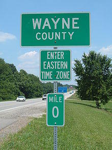 Wayne County is on Eastern Time; however, its western border, shared with Clinton and Russell Counties, is part of the Eastern/Central time zone boundary, as is its southern border with Pickett County, TN. Wayne County observed Central time until October 2000; an account of this change is documented in an article by Dr. Stanley Brunn of the University of Kentucky.[10]