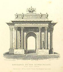 At Hyde Park Corner, the King required "some great ceremonial outwork that would be worthy of the new palace that lay to its rear",[4] and accepted Burton's consequent proposal for a sequence comprising a gateway and a classical screen, and a triumphal arch, which would enable those approaching Buckingham Palace from the north to ride or drive first through the screen and then through the arch, before turning left to descend Constitution Hill and enter the forecourt of Buckingham Palace through Nash's Marble Arch.[4] The screen became the neoclassical Hyde Park Gate/Screen at Hyde Park Corner, which delighted the King and his Committee, and which the architectural historian Guy Williams describes as "one of the most pleasing architectural works that have survived from the neo-classical age".[4] The triumphal arch became the Wellington Arch at Constitution Hill into Green Park, London, which has been described as "one of London's best loved landmarks".[5] Burton's original design for the triumphal arch, which was modelled on the Arch of Titus at Rome, on which the central and side blocks of the Screen had been modelled, was more technically perfect, and coherent with the Screen, than that of the arch that was subsequently built: this original design, however, was rejected by the Committee – who had envisaged a design based on the Arch of Constantine, on which Nash's Marble Arch had been modelled – because it was not sufficiently ostentatious.[6] Burton created a new design, "to pander to the majestic ego",[6] which was much larger and modelled on a fragment found in the Roman Forum, which was accepted on 14 January 1826, and subsequently built as the present Wellington Arch.[6]