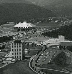Preparation for the baby boomer generation and plans for curriculum expansion led to the purchase of land for the Evansdale and Medical campuses. The growth of downtown Morgantown limited the space available on the original campus; therefore, the new site was nearly two miles north on what had been farmland.[21] Beginning in the late 1950s the university experienced the most rapid period of growth in its history. In 1957, WVU opened a Medical Center on the new campus and founded the first school of dentistry in West Virginia. The basketball program reached a new level of success when the university admitted future 14‑time NBA All-Star and Hall of Fame player Jerry West, who led the team to the national championship game in 1959.[32] As enrollment approached 14,000 in the 1960s, the University continued expansion plans by building the Evansdale Residential Complex to house approximately 1,800 students, the Mountainlair student union, and several engineering and creative arts facilities on the Evansdale campus. In 1970 the WVU Coliseum, a basketball facility with a capacity of 14,000, opened near the new campus.[28] As the facilities expanded, the university researched ways to move its growing student population across the split campuses and to solve its worsening traffic congestion. The resulting Personal Rapid Transit system opened in 1973 as the world's first automated rapid transit system.[33]