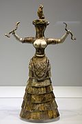 "Snake Goddess" figurine; 1460-1410 BC (from the Minoan Neo-palatial Period); faience; height: 29.5 cm; from the Temple Repository at Knossos; Heraklion Archaeological Museum
