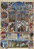 Page of Très Riches Heures du Duc de Berry depictic the funeral of Raymond Diocrès; 1411-1416 and 1485–1486; tempera on vellum; height: 29 cm, width: 21 cm; Condé Museum (Chantilly, France)