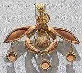 Much surviving prehistoric art is small portable sculptures, with a small group of female Venus figurines such as the Venus of Willendorf (24,000–22,000 BC) found across central Europe;[8] the 30 cm tall Löwenmensch figurine of about 30,000 BCE has hardly any pieces that can be related to it. The Swimming Reindeer of about 11,000 BCE is one of the finest of a number of Magdalenian carvings in bone or antler of animals in the art of the Upper Paleolithic, though they are outnumbered by engraved pieces, which are sometimes classified as sculpture.[9] With the beginning of the Mesolithic in Europe figurative sculpture greatly reduced,[10] and remained a less common element in art than relief decoration of practical objects until the Roman period, despite some works such as the Gundestrup cauldron from the European Iron Age and the Bronze Age Trundholm sun chariot.[11]