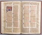 Bifolium with the decretals of gratian; circa 1290; tempera and gold on parchment, brown ink, and modern leather binding; overall: 48.3 x 29.2 x 1.3 cm, opened: 47.2 cm; Metropolitan Museum of Art