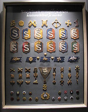 The first ad hoc symbols were a white armband and a small, three-branched shoot from a spruce branch, placed into the hat. The basic insignia was an embroidered badge with a white "S" topped by three single shoots of spruce branches. The badge and the "S" were embroidered with a gold-colored border. The symbol worn by General C.G.E. Mannerheim had a blue field, but in the provinces, the field was divided (party per sinister), with two or three colors representing each province. The white armband also bore the name of the municipality. Each chapter had its own flag, but generally it was a symmetric variant of the modern State Flag of Finland where the cross was extended with small swastika arms, the "S" symbol in the canton and local symbols instead of the coat of arms.[10]