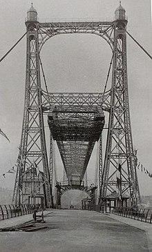 An Act of Parliament was obtained in 1900 giving approval for the bridge, and the Act also allowed for the formal ending of the ferry.[8] It was designed by John Webster and John Wood.[9] Construction began in December 1901 and was completed in 1905. The cost was £130,000 (equivalent to £14,060,000 in 2019).[10] The transporter bridge was opened (in the absence of King Edward VII who was indisposed) by Sir John Brunner on 29 May 1905.[11]