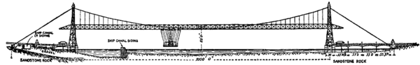 At the beginning of the 20th century the only means of crossing the river Mersey at Runcorn Gap were by rail on the Runcorn Railway Bridge (which also had a footpath) or by using the ancient ferry (a rowing boat). In the 1890s the Manchester Ship Canal had been constructed and this meant that the journey by ferry had to be made in two stages, with a climb over the wall of the canal between the stages. A road bridge was clearly needed but it would have to pass high enough over the canal to allow the passage of ocean-going ships. The cost of doing this was felt to be prohibitive.[4]