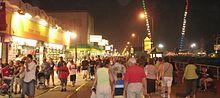 Wildwood is a resort city that is very popular with vacationers and tourists mostly from New Jersey, Delaware, Maryland, Pennsylvania, New York, and even nearby parts of Canada (particularly Ontario and Quebec) during the summer months. The year-round population of Wildwood of over 5,300 grows to as many as 250,000 or more during the peak tourist season during the summer.[59] Its most notable features are its beach and 1.8 miles (2.9 km) boardwalk, home to the Morey's Piers amusement complex and Raging Waters and Ocean Oasis waterparks owned by Morey's Piers. The boardwalk features a trolley called the "Tramcar", which runs from end to end. In June 2006, its Doo-Wop-style motels were placed on the National Trust for Historic Preservation's annual Eleven Most Endangered List,[60] described as "irreplaceable icons of popular culture."[61][62] In June, thousands of recently graduated high school seniors come to Wildwood for Senior Week. During Senior Week, the graduates stay in hotels and rent beach houses in Wildwood where they party and participate in underage drinking.[63][64]