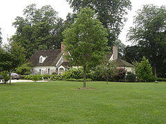 The Wye plantation was created in the 1650s by a Welsh Puritan and wealthy planter, Edward Lloyd. Between 1780 and 1790, the main house was built by his great-great-grandson, Edward Lloyd IV, using the profits generated by the forced labor of enslaved people.[3] It is cited as an example between the transition of Georgian and Federal architecture, which is attributed to builder Robert Key. Nearby the house is an orangery, a rare survival of an early garden structure where orange and lemon trees were cultivated, and which still contains its original 18th-century heating system of hot-air ducts.[4][5]