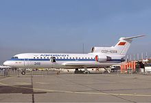 The Yakovlev Yak-42 (Russian: Яковлев Як-42; NATO reporting name: "Clobber") is a 100/120-seat three-engined mid-range passenger jet. It was the first airliner produced in the Soviet Union to be powered by modern high-bypass turbofan engines.[2]